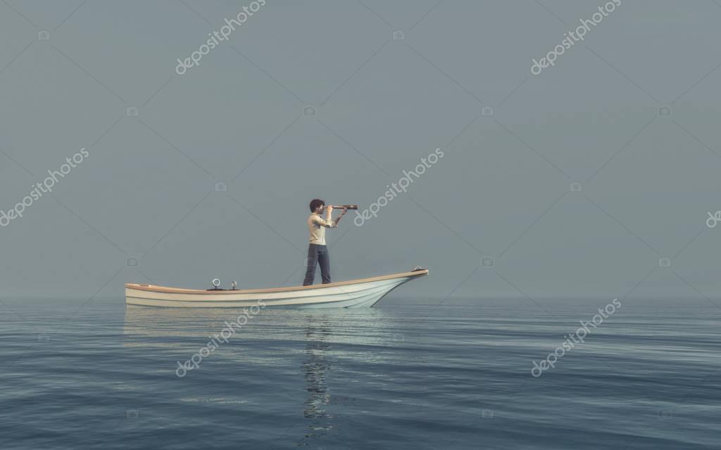Man watching through a spyglass in a boat afloat the sea. This is a 3d render illustration