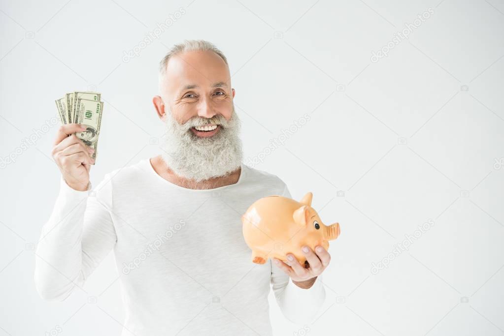 Smiling senior bearded man with dollar banknotes and piggy bank, isolated on white