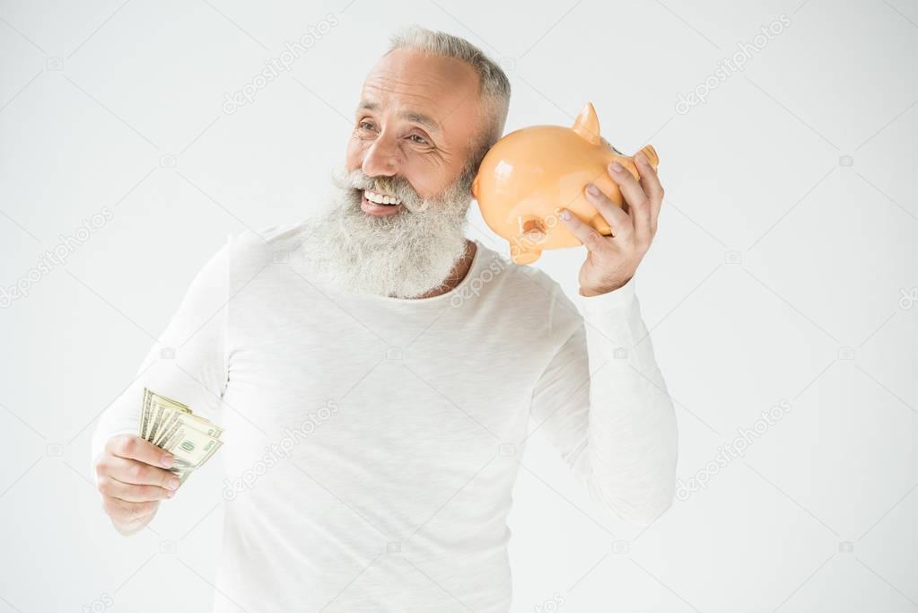 Smiling senior bearded man with dollar banknotes and piggy bank, isolated on white