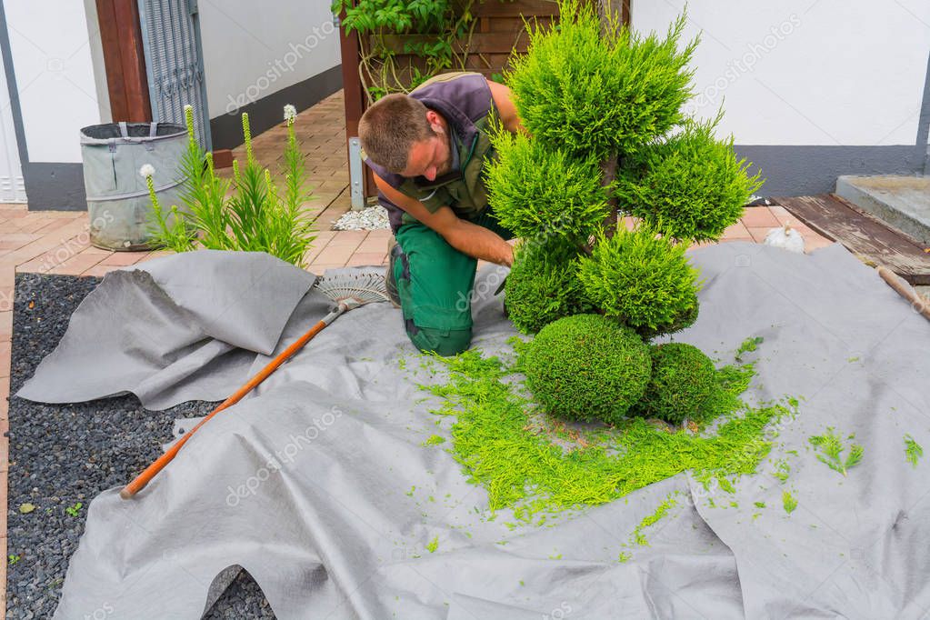 - Small life trees or thuja cut in shape on a meadow.