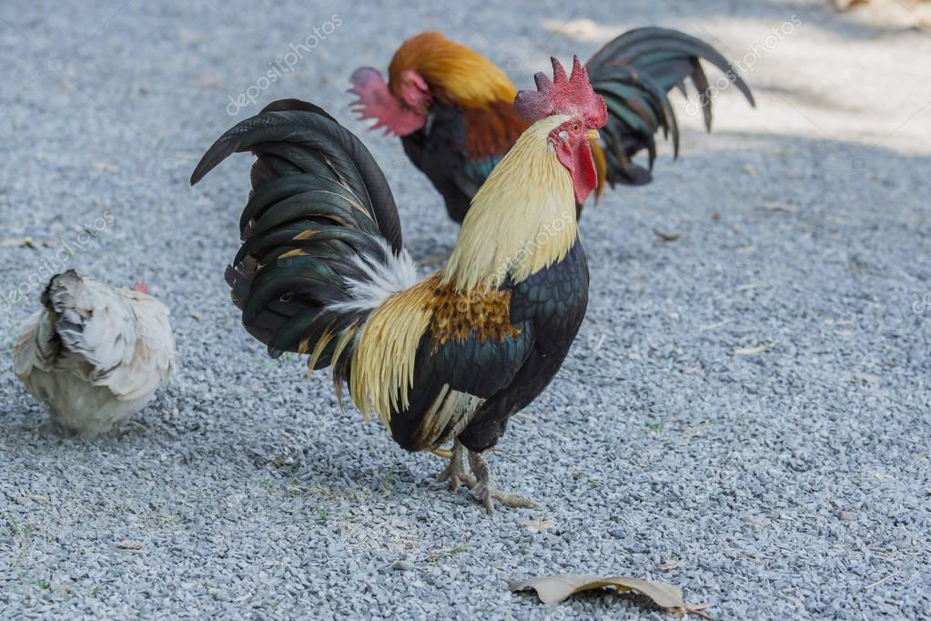 Close up portrait of bantam chickens, Beautiful colorful cock