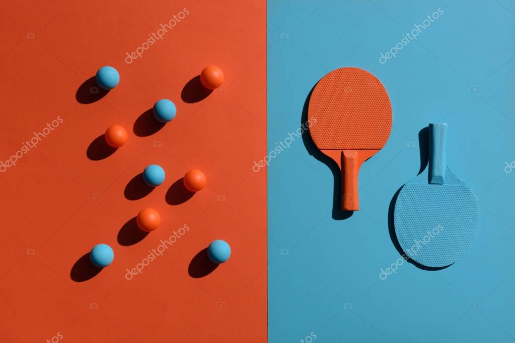Top view shot of composition with ping pong rackets and balls placed on two toned surface