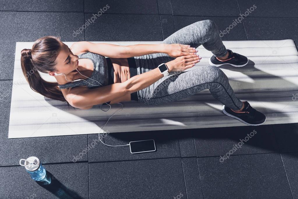 Overhead view of athletic woman listening music in earphones while doing abs exercises on mat