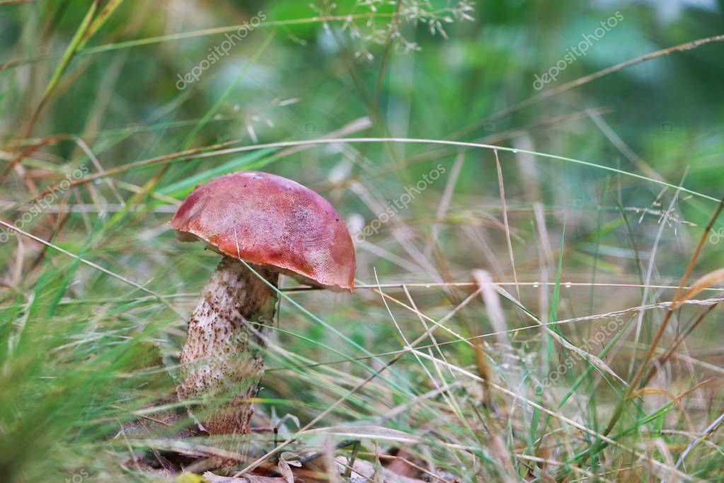 Large orange cap boletus grow in grass wood. Red Leccinum mushroom growing in forest. Beautiful edible bolete