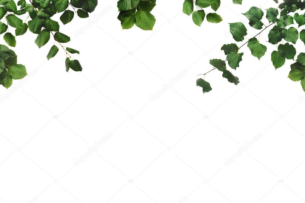 Branches and twigs with green leaves isolated on white