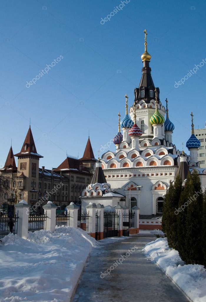 Temple " Satisfy washing grief " on a background of a conservatory in the winter in Saratov.