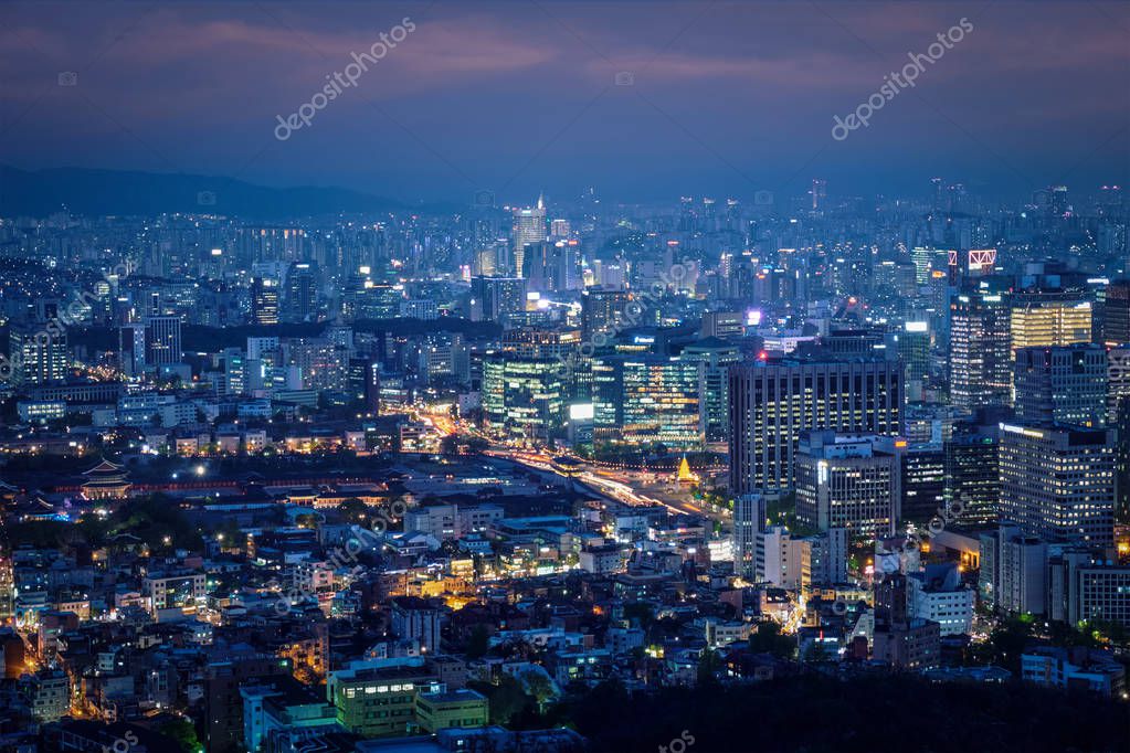 Seoul downtown cityscape illuminated with lights and Gyeongbokgung Palace in the evening view from Inwang mountain. Seoul, South Korea.