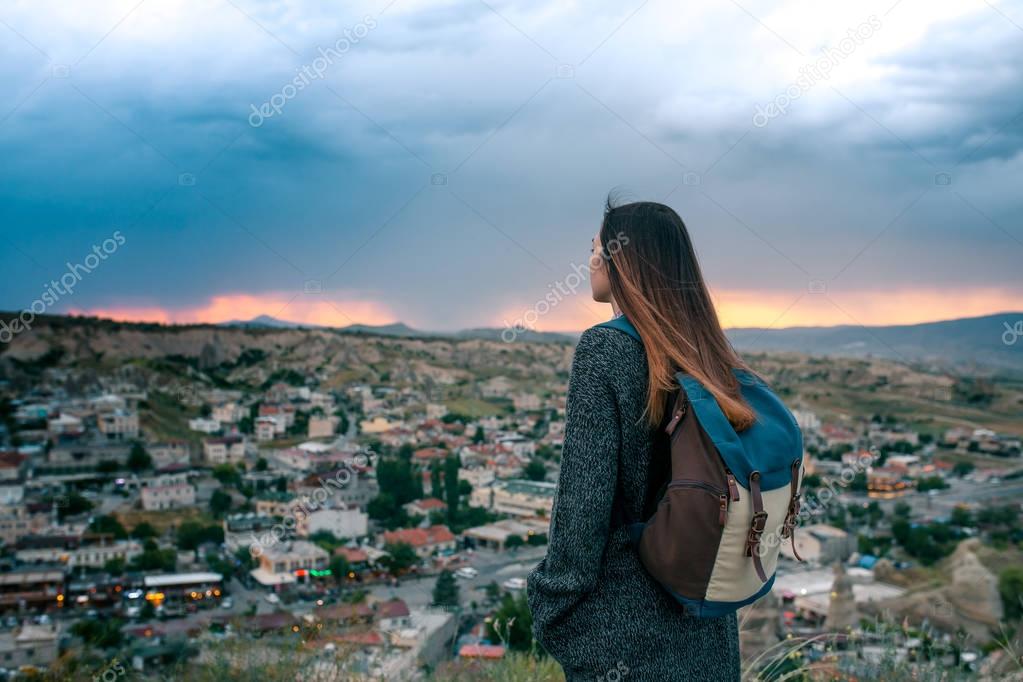 Young woman tourist from a high point looking at the sunset over the city of Goreme in Turkey and dreaming. Tourism, vacation.