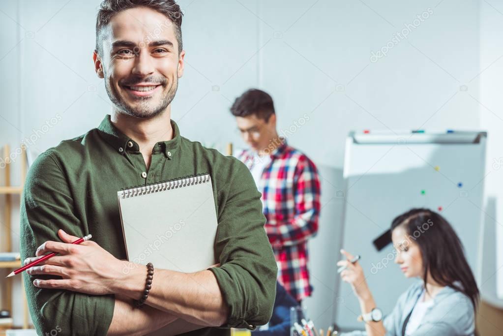 HAPPY GIRL YOUNG ADULT PEOPLE CHEERFUL SMILE YOUTH EUROPEAN MEN BLANK STYLISH HOLD NOTEBOOK LIFESTYLE LEARNING EDUCATION STUDYING INDOORS PENCIL INSIDE LEARN STUDY CASUAL KNOWLEDGE EDUCATIONAL STUDENTS SCHOOLING ACADEMIC TUITION MULTIETHNIC LOOKING AT CAMERA COPY SPACE SELECTIVE FOCUS ASIAN MAN CAUCASIAN WOMAN CAUCASIAN MAN
