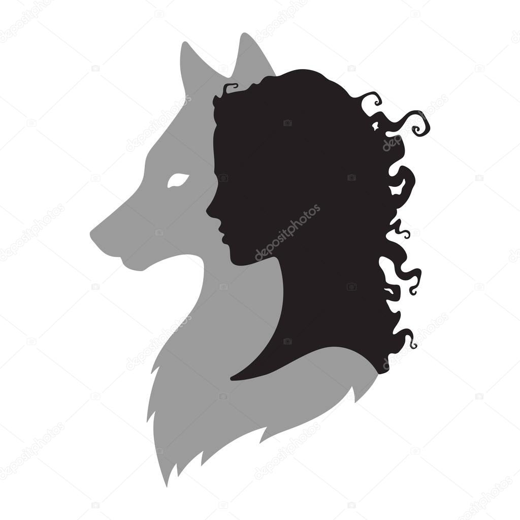 Silhouette of beautiful woman with shadow of wolf isolated. Sticker, print or tattoo design vector illustration. Pagan totem, wiccan familiar spirit art.
