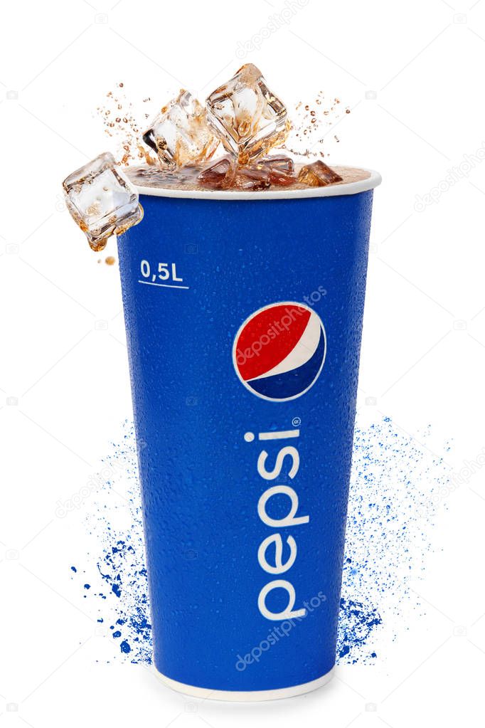 Nachod, Czech Republic May 15 2017: photo of Pepsi take away cup with ice cubes isolated on white background. Pepsi Company