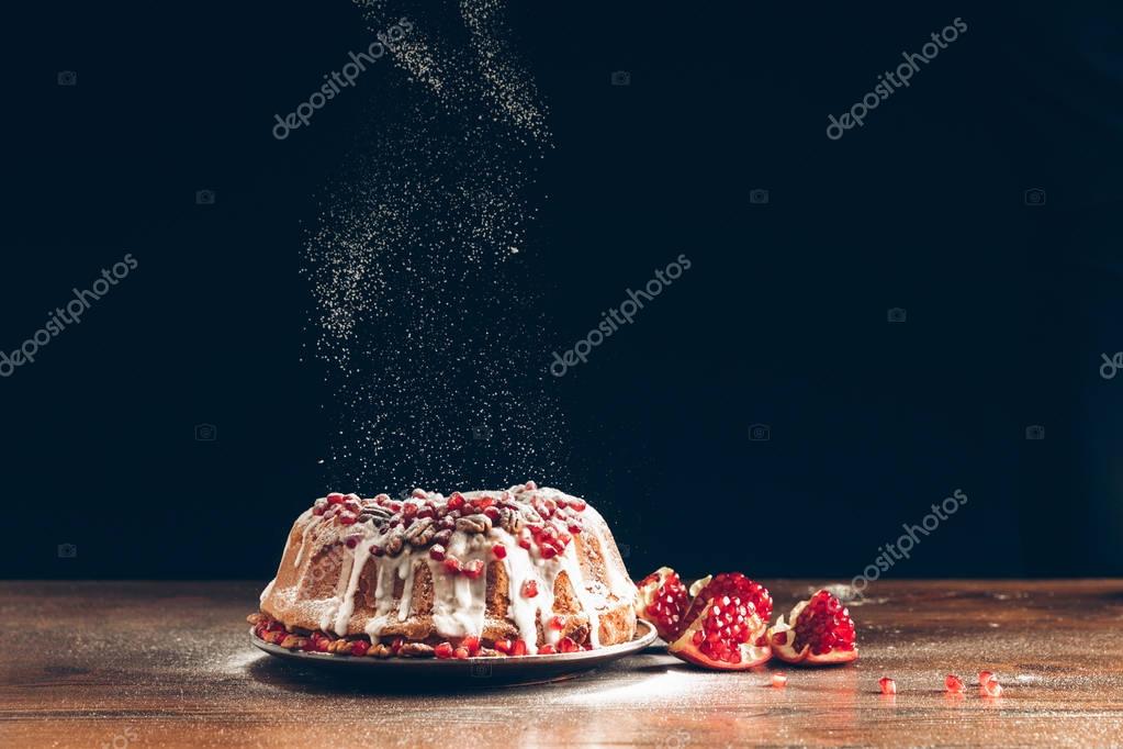 Traditional homemade christmas cake with pomegranate powdering with icing sugar