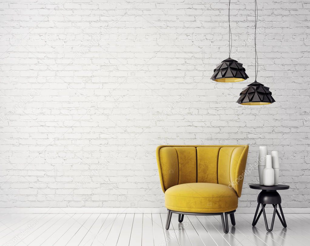 3d render illustration of modern living room with yellow armchair and lamps hanging from ceiling