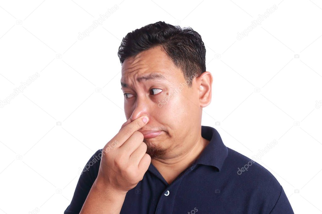 Photo image of funny Asian man closing his nose with finger because of disgusting bad smell odor aroma, isolated on white