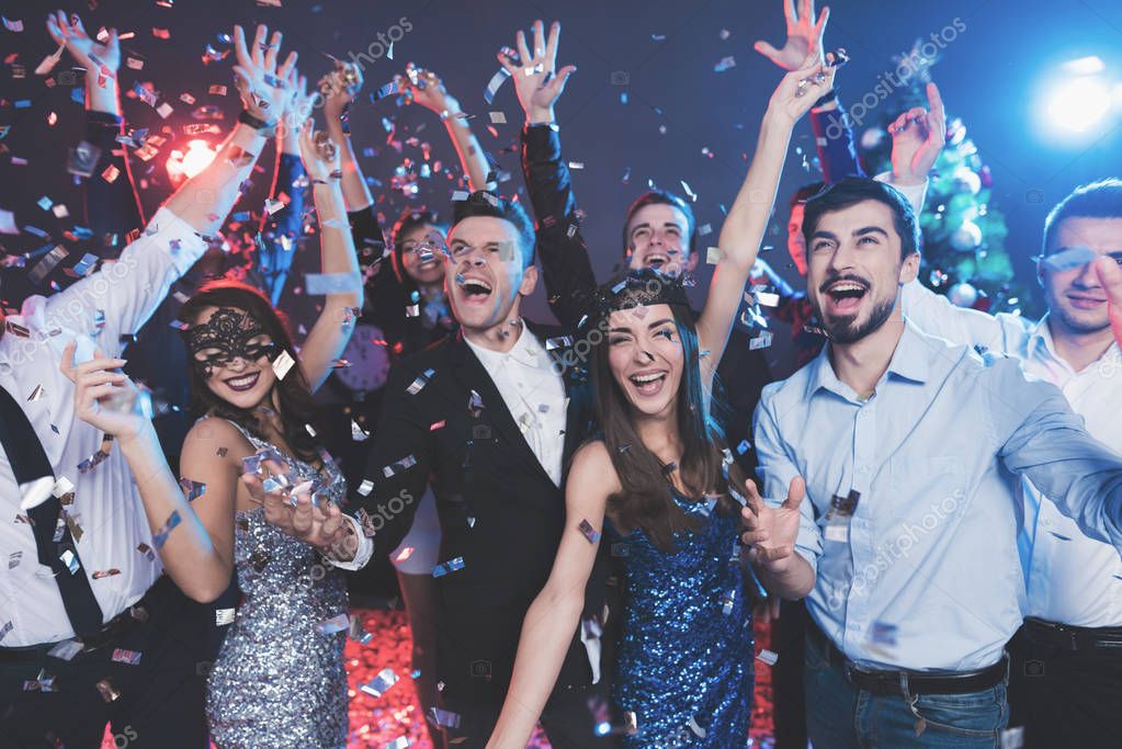- Young people have fun at a New Year's party. Around them flies confetti. They are having fun. Around them flies confetti. Everyone is fun, people raised their hands up and are happy.