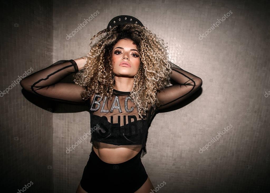 Beautiful female gangster portrait posing while wearing transparent shirt