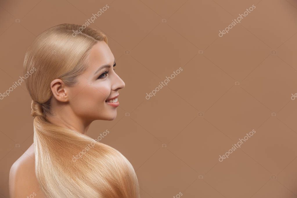 COLORFUL BEAUTIFUL PERSON GIRL FEMALE YOUNG SMILING ADULT PEOPLE BEAUTY MODEL CHEERFUL SMILE FACE CARE STYLE FASHION PRETTY GLAMOUR COSMETIC EYESHADOW MAKEUP SKINCARE HAIRDO BLONDE LOOK ALONE ATTRACTIVE HAIRCARE VISAGE MODELING STYLING LONG HAIR STUDIO SHOT BLONDE HAIR VIEW FROM BEHIND FASHION SHOOT CAUCASIAN WOMAN ISOLATED ON BEIGE