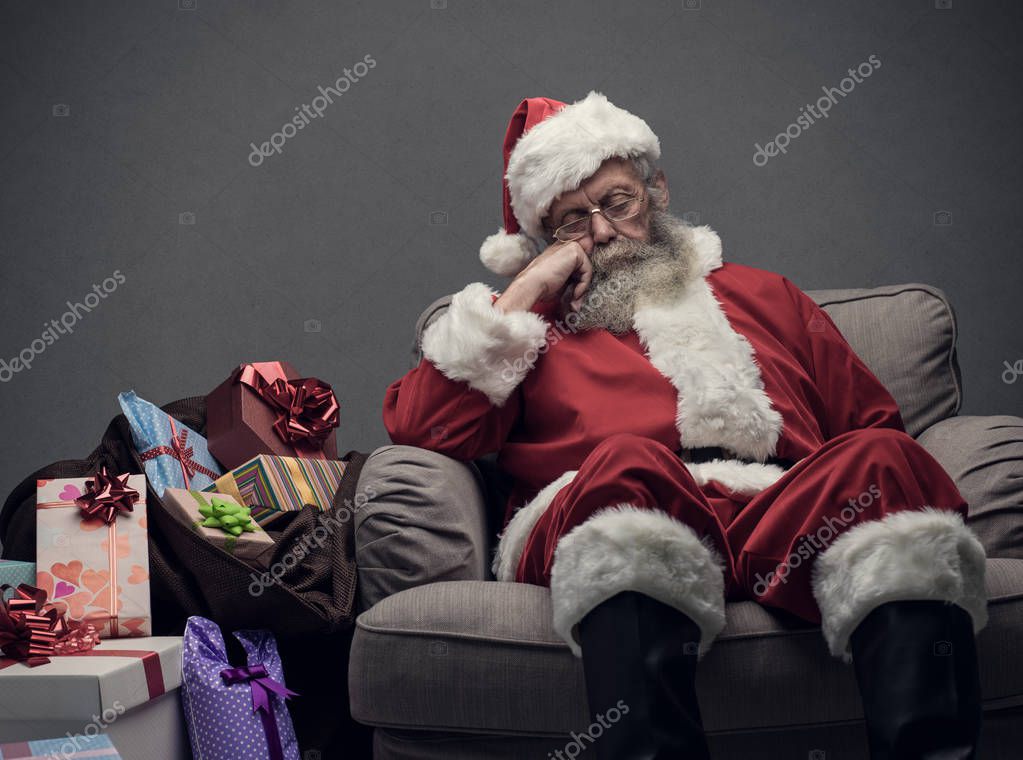Sleepy Santa Claus taking a nap and relaxing on the armchair on Christmas Eve