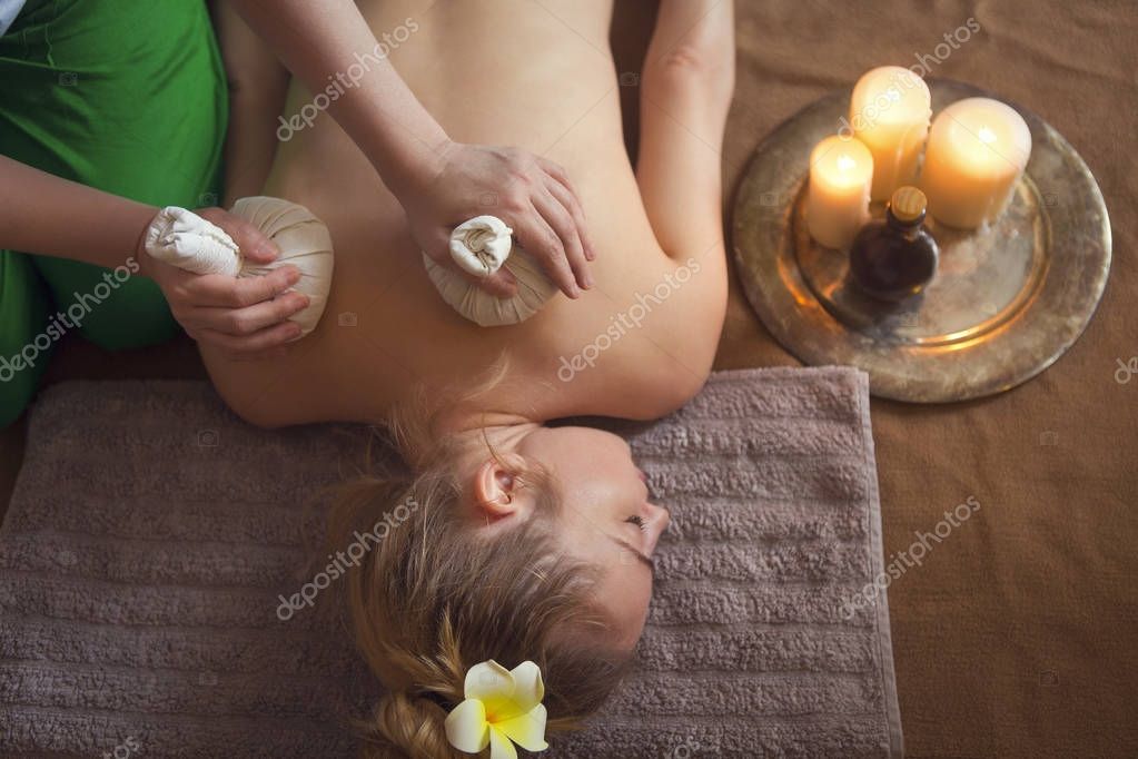 - Woman getting thai herbal compress massage in spa