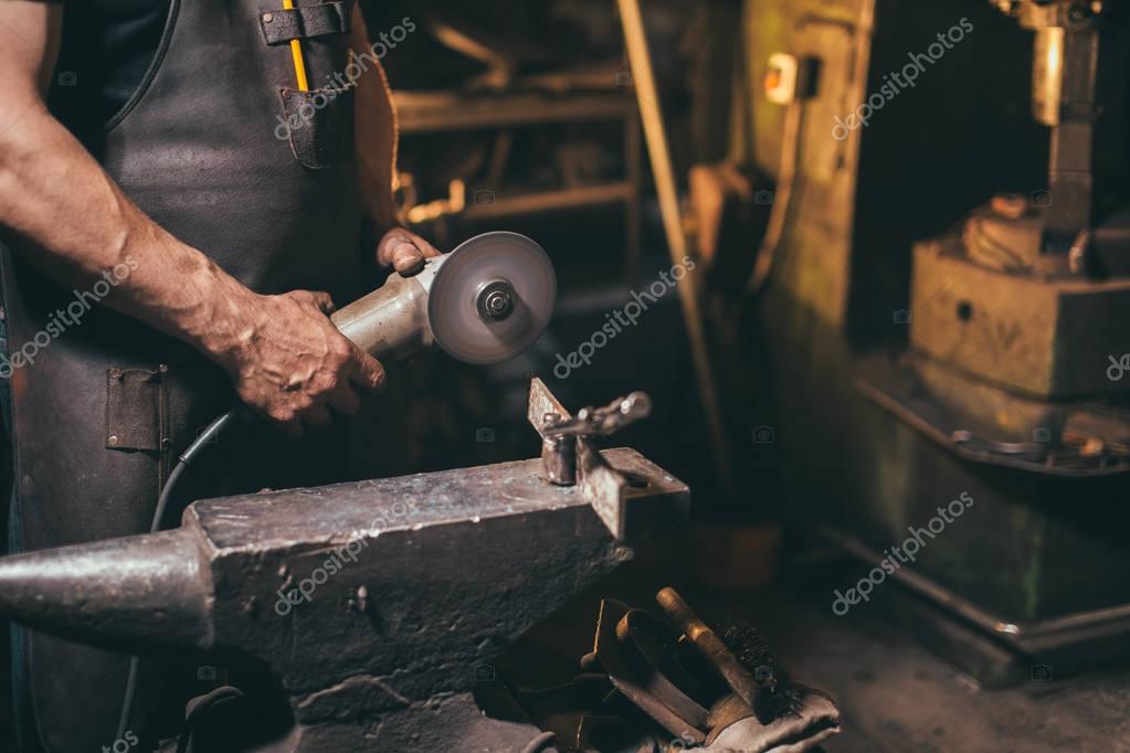 Worker Using Angle Grinder in Factory and throwing sparks