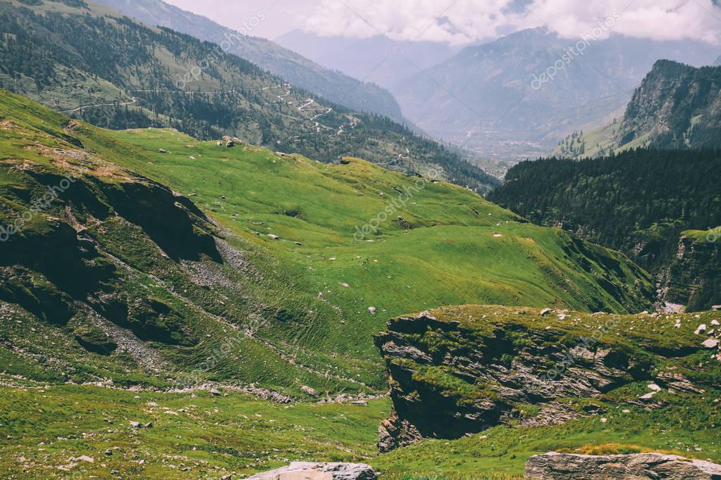 Majestic rocky mountains covered with green grass and moss in Indian Himalayas, Rohtang Pass
