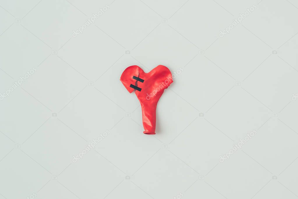- top view of broken heart shaped balloon with insulating tape isolated on white, valentines day concept