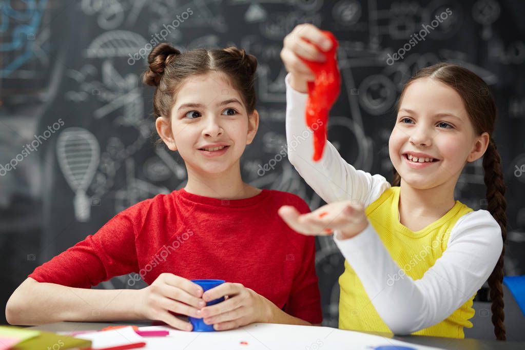 Playful girl having fun with red slime while her friend looking at this