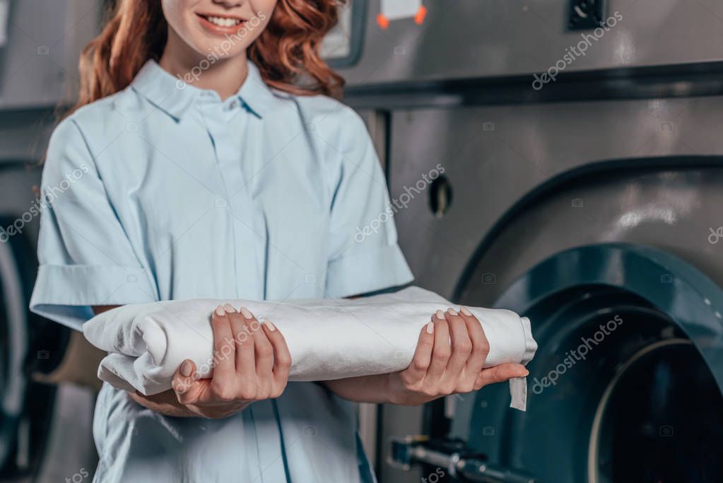 - cropped shot of female dry cleaning worker holding stack of clean white clothes