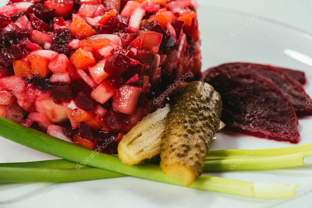 Vinaigrette salad laying on plate with marinated cucumbers and green onion
