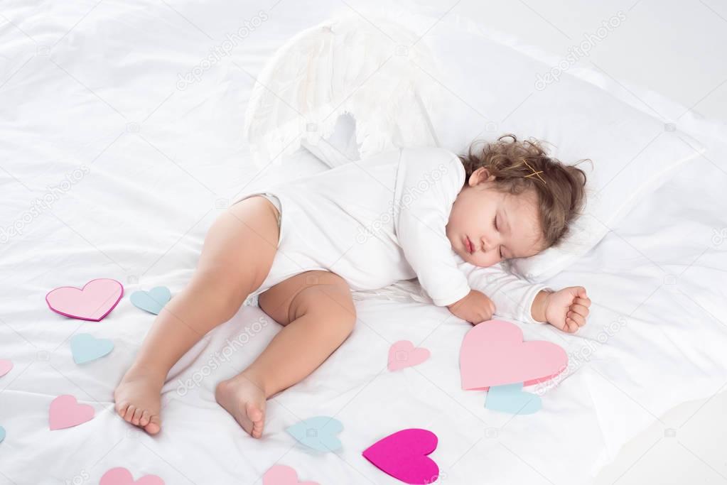Little cherub with wings sleeping on bed with hearts