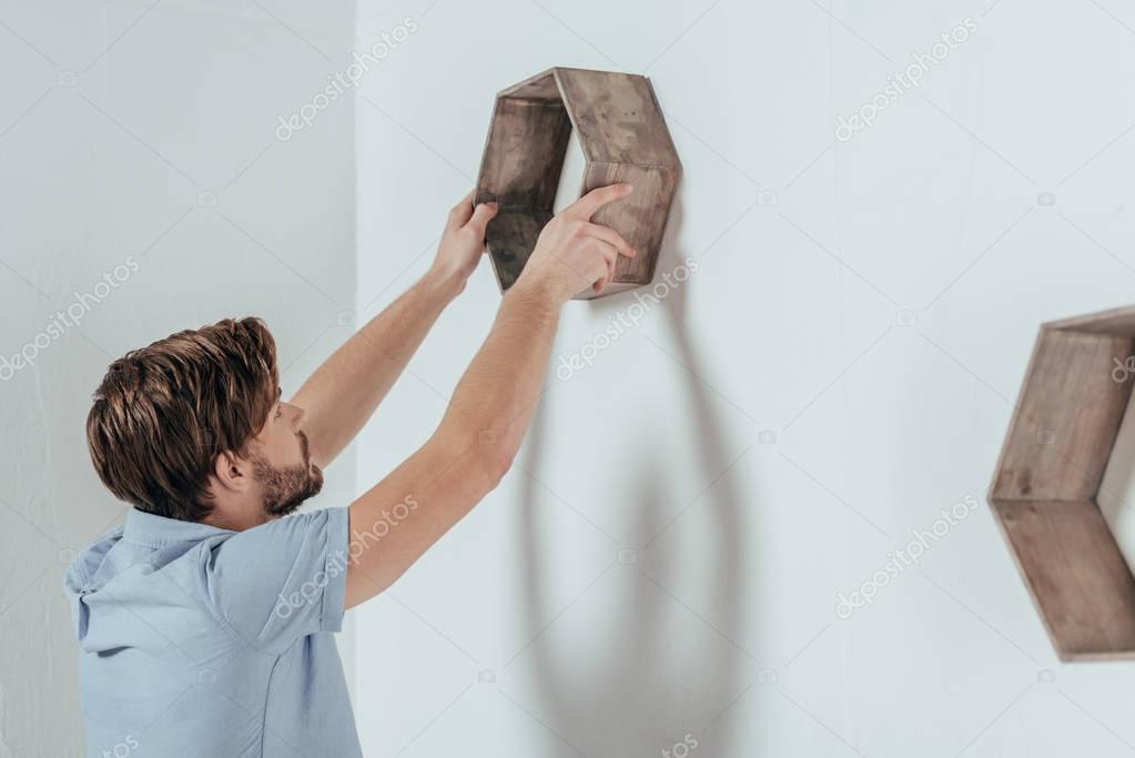 young man hanging wooden frame at home