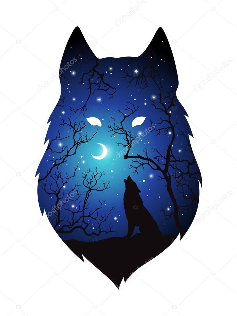 - Double exposure silhouette of wolf in the night forest, blue sky with crescent moon and stars isolated. Sticker, print or tattoo design vector illustration. Pagan totem, wiccan familiar spirit art