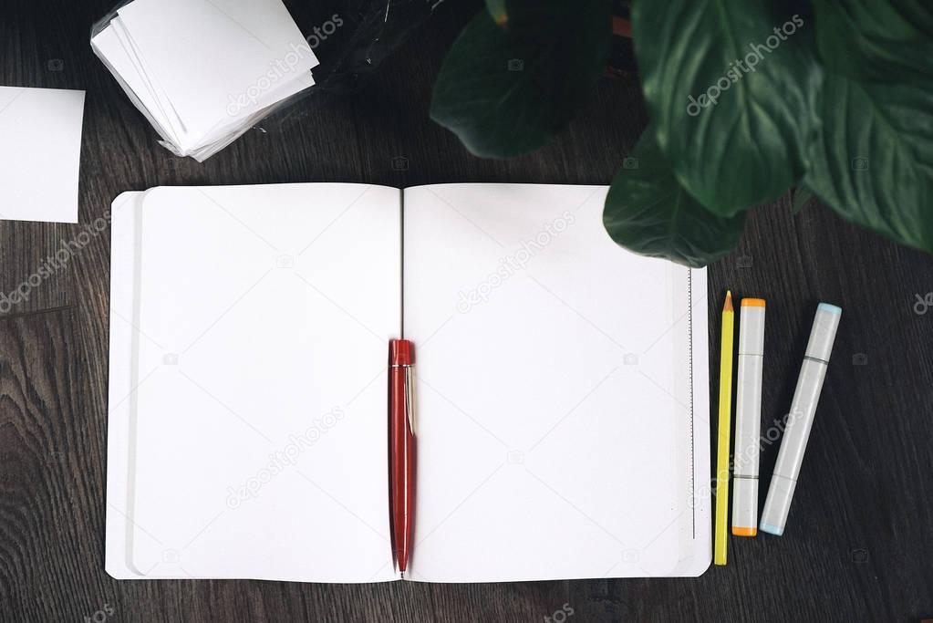- on a wooden floor lies a notebook with clean white sheets and a red pen,
