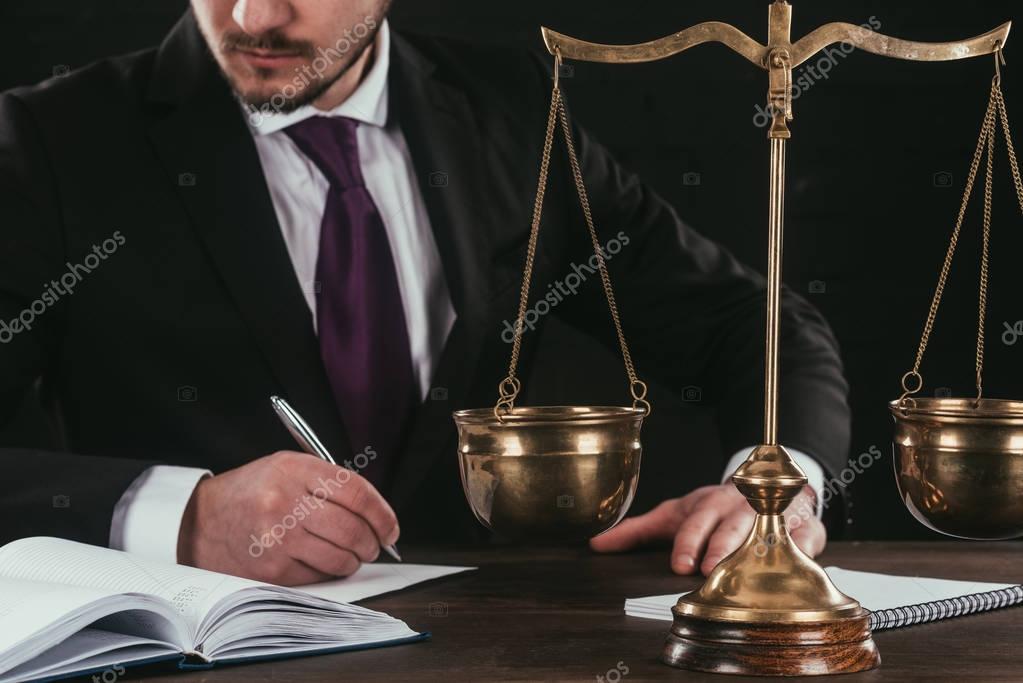 - cropped shot of lawyer doing paperwork at workplace with scales isolated on black