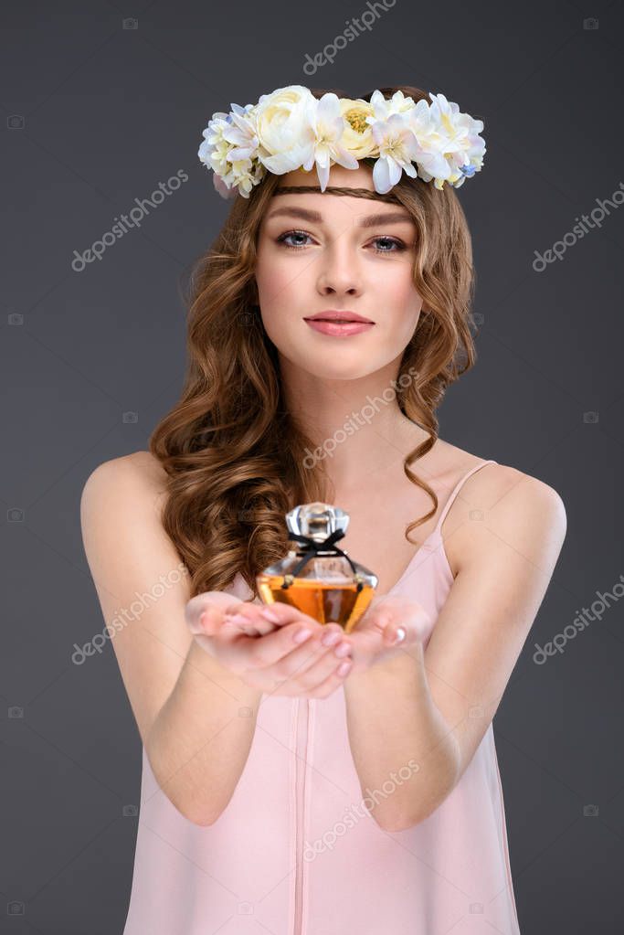 - beautiful young woman in white floral wreath holding bottle of perfume isolated on grey