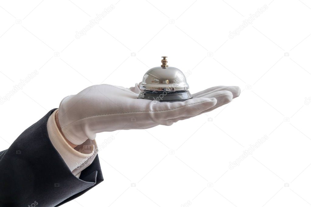 - Hand in white glove is holding service bell. Isolated on white b