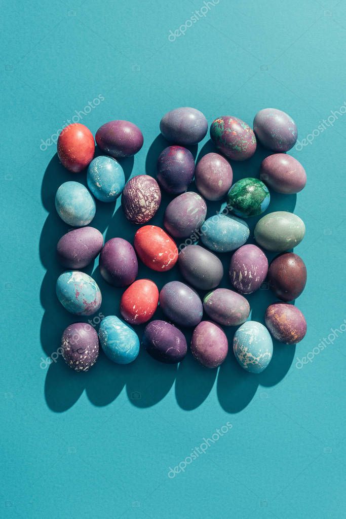 Food composition with easter eggs in square shape, on blue