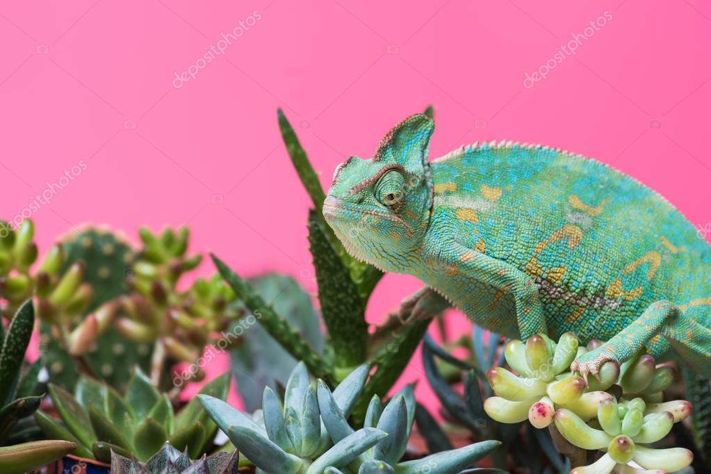 cute colorful chameleon crawling on succulents isolated on pink