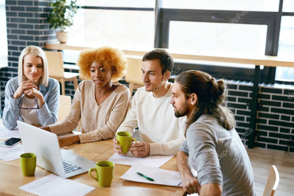 Friends Working Together At Cafe, Using Computer, Drinking Coffee And Sharing Ideas. Beautiful Smiling Women And Handsome Men Talking About Project. Business People Team Work. High Quality