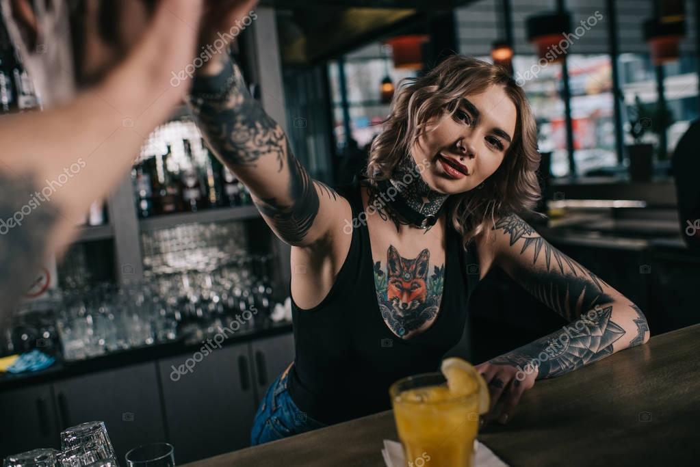 cropped image of tattooed bartender giving high five to visitor at bar