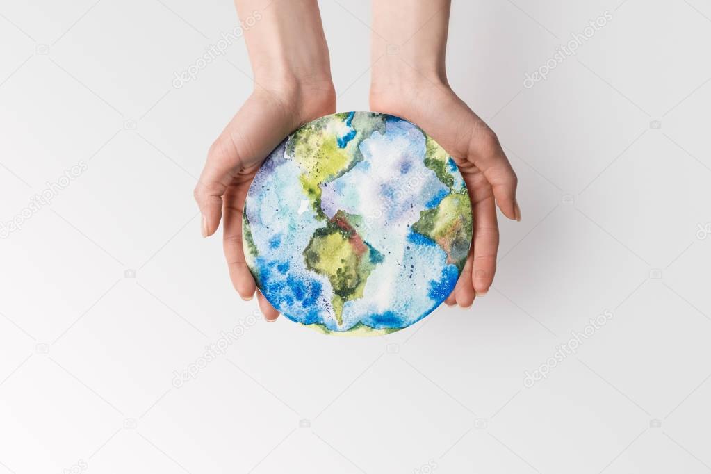 Cropped shot of woman holding handmade globe in hands isolated on grey, environment protection concept