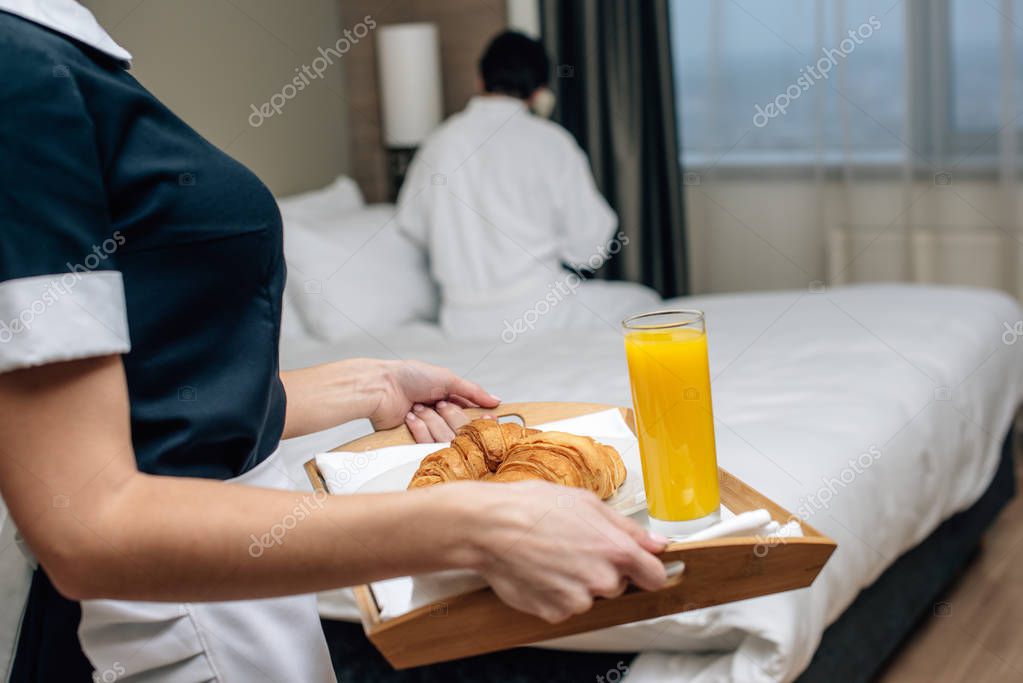 - cropped shot of maid in uniform holding tray with croissants and juice for hotel guest