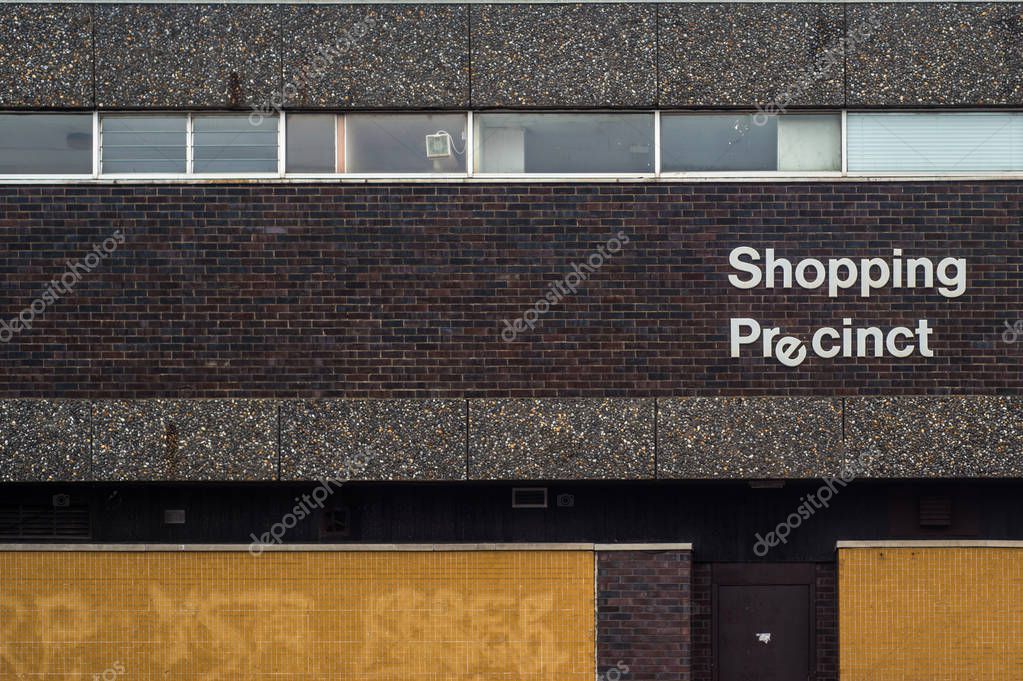 Recession Image Of A 1970s Style Grim Urban Rundown British Shopping Precinct Sign
