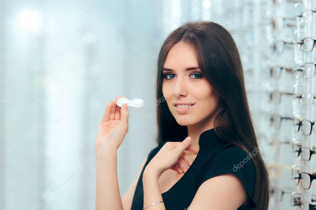 Happy Woman Holding Contact Lenses Case in Optician Store
