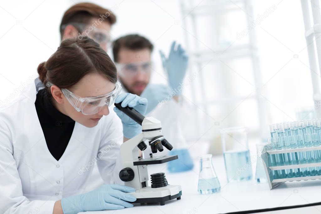 Female scientists looking into a microscope.photo with copy space
