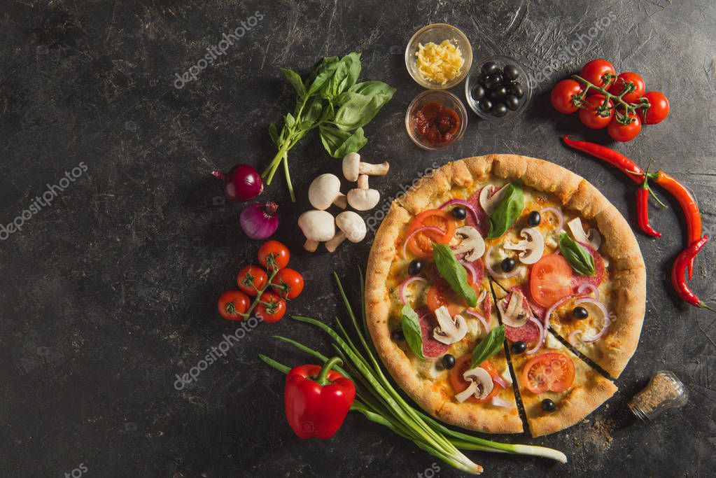 - flat lay with italian pizza and fresh ingredients on dark surface