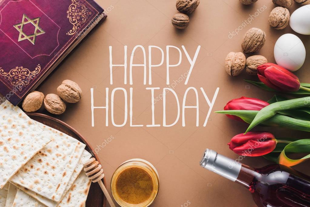 Top view of traditional book with text in hebrew and happy holiday greeting