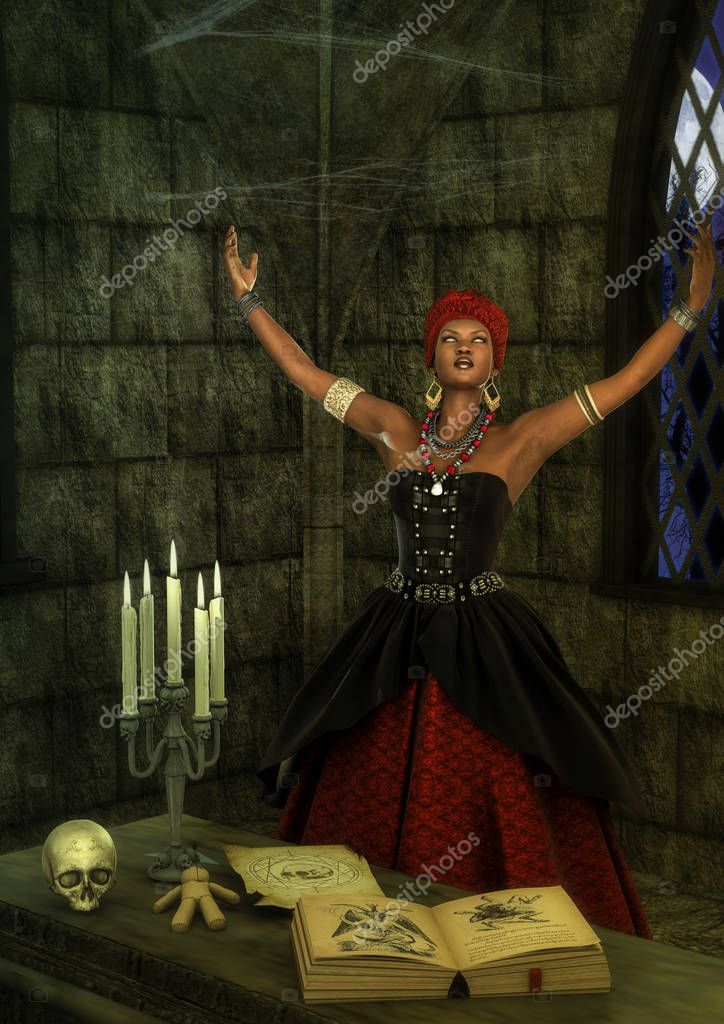- Voodoo queen in trance in front of a witchcraft altar.