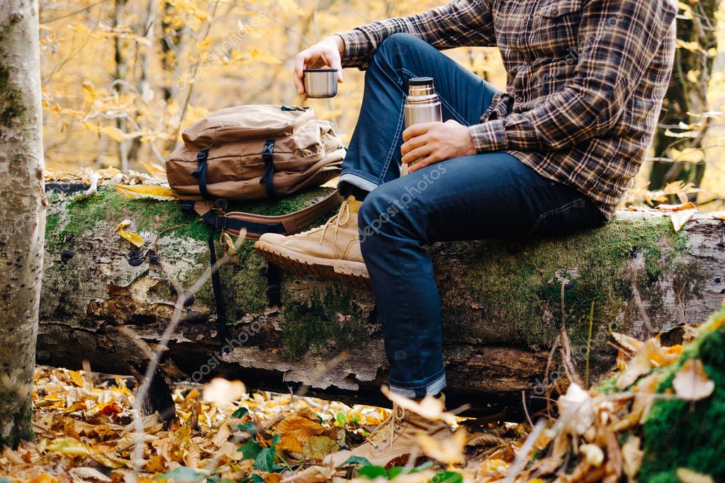 Unrecognizable young man resting with cup of tea in autumn forest.