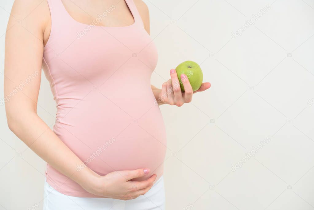 - cropped shot of pregnant woman with green apple on white